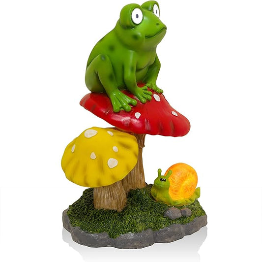 Alpine Corporation ZEN390SLR-S Frog on Mushroom Statue with LED Lights, Solar-Powered LED Frog Garden Statue, 12" H, Green