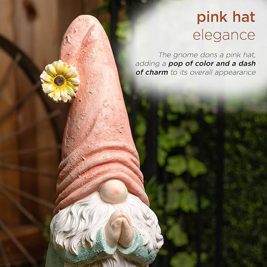 Alpine Corporation MCC846 Indoor/Outdoor Praying Gnome with Sunflower Garden Statue, Peaceful Gnome Statue w/Hat, 23" H, Pink