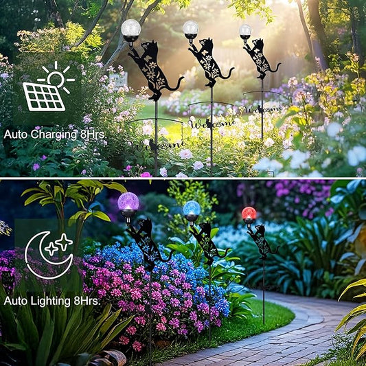 40’’ Metal Black Cat Silhouette Solar Garden Statue Outdoor with Color Changing Crackle Glass Ball Light Decorative Welcome Home Yard Sign Stakes