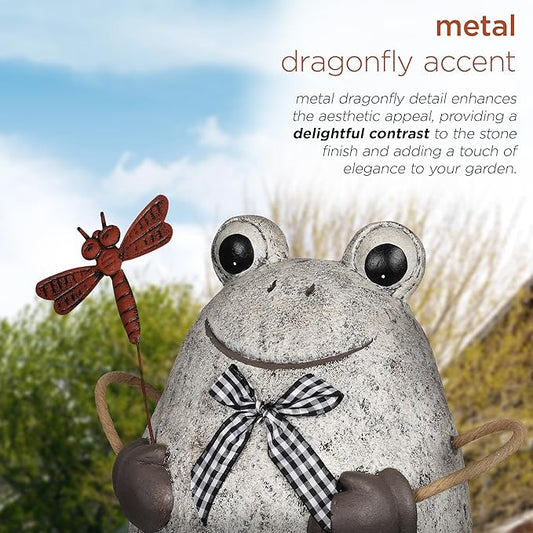 Alpine Corporation MCC862 Indoor/Outdoor Frog with Dragonfly Garden Statue, Stone Finish Frog Statue for Yard, 24" H, Silver