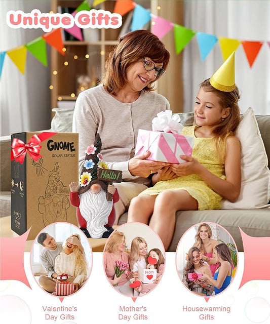 Solar Gnome Garden Statue for Decor: Outdoor Figurines Sculpture with Lights and Hello Sign for Lawn Patio Yard Balcony - for Mother Women