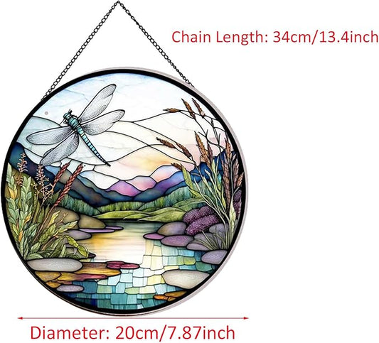 River and Dragonfly Pattern Suncatcher Stained Glass,Hanging Stained Glass for Windows,20cm/7.87inch Hand-Painted Sun Catcher Garden Hangings Painted Glass Panel Decor Themed Gift