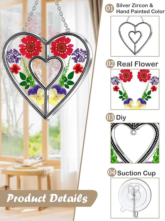 KY&BOSAM Heart Suncatchers DIY Stained Glass Hangings for Windows Wind Chimes Home Gardner Decor with Pressed Real Flowers Heart No Charm Birthday Gifts for Women Mother`s Day Christmas Ornamets