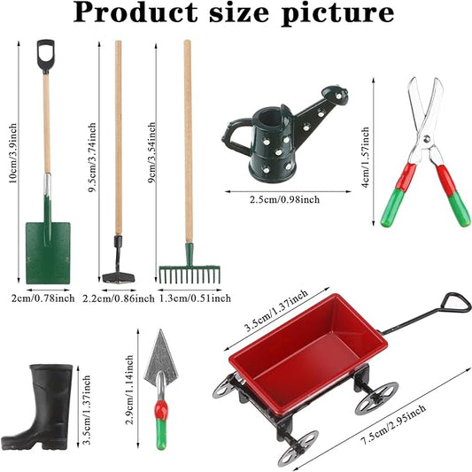 Miniature Fairy Garden Accessories Set 9 Pcs 1:12 Mini Metal Spade Pestle Kettle Wagon Rake Garden Watering Supplies Micro Landscape Ornaments Dollhouse Accessories