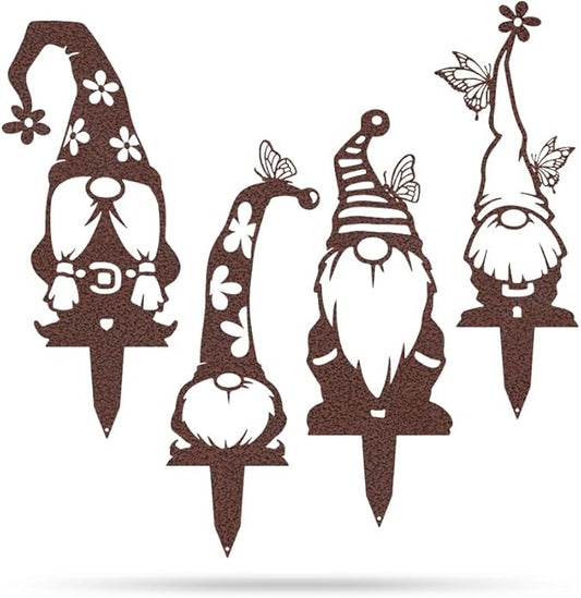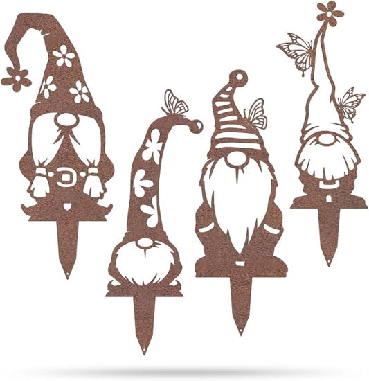 RealSteel Metal Garden Gnomes Outdoor – Steel 4 Pack Lawn Ornaments & Statues, Funny Yard Decor, Weatherproof Garden Decoration, Gift for Gardeners (Rust)