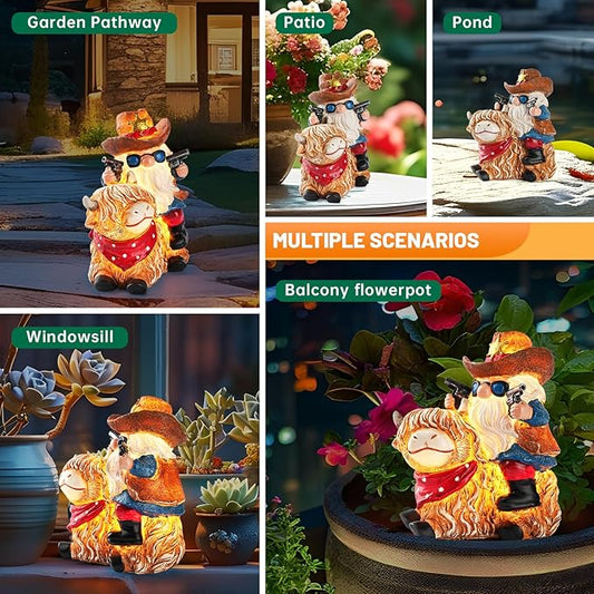 Garden Gnome Statue on Highland Cow with Solar Lights – Funny Outdoor Resin Decor for Patio, Lawn, Yard – Unique Gift for Women, Grandma, Mother's Day, Birthday, Housewarming