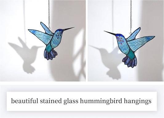Lolitarcrafts Stained Glass Hummingbird Window Hangings with Flowers, Bird Stained Glass Suncatcher for Window Decor Hummingbird Gifts for Mom,Bird Lovers (Blue B)