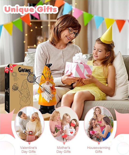 Solar Gnome Statues Outdoor Decor: Garden Figurines Sculpture with Glowing Butterfly and Catching Dragonfly for Yard Porch Patio Balcony - Gifts for Mother Grandma
