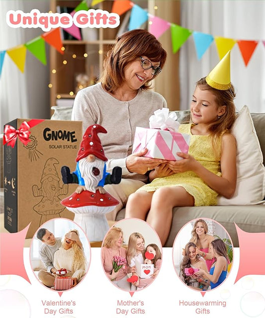 Solar Gnome Statues Outdoor Decor: Garden Figurines Sculpture with Mushroom for Yard Porch Patio Balcony - Gifts for Mother Grandma