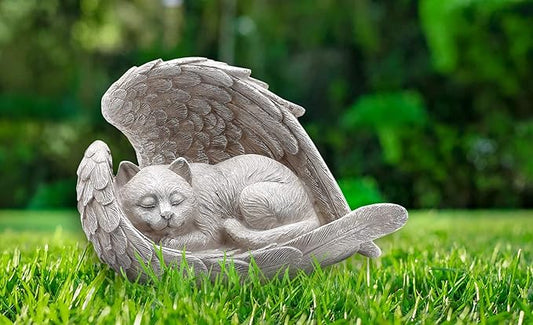 Sleeping Cat Within Angel Wings 8.5 x 5.5 Resin Stone Pet Memorial Figurine, Concrete Grey