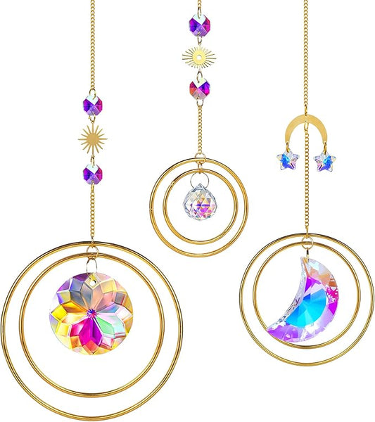 Set 3 Crystal Hanging Decorations - Sun & Moon Rainbow Crystal Suncatcher Window Car Hanging Prisms Ornament Pendant,Boho Love Wall Decoration,Home Garden Decor Gift