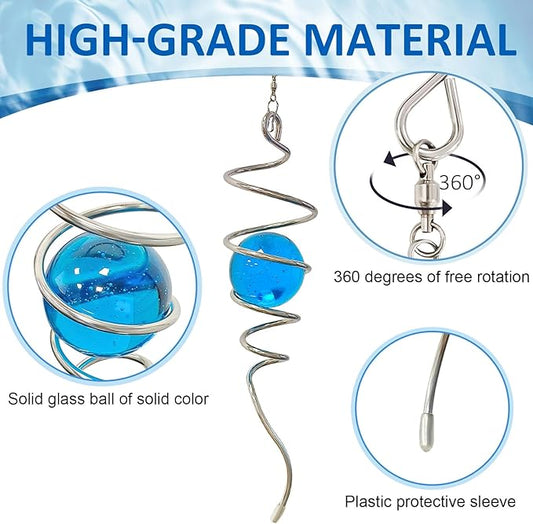 Gazing Ball Spiral Tail with Blue Glass Orb, 3D Wind Spinners Stabilizer, Wind Spinner Spiral, Hanging Rotating Art Decor - Visual Illusion in Spinning, Indoor Outdoor Garden Decoration 13in