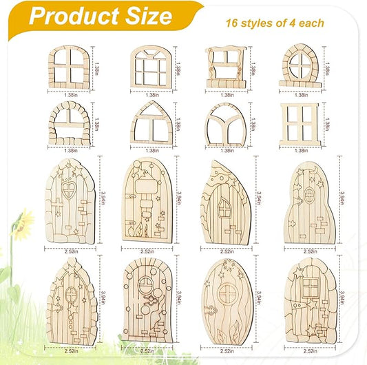 64 Pcs Fairy Door Mini Wooden Garden Doors Unfinished DIY Craft Fairy House Kit Unpainted Wood Miniature Door Blank Fairy House Doors and Windows for Home Office Wedding Party Decoration Accessories