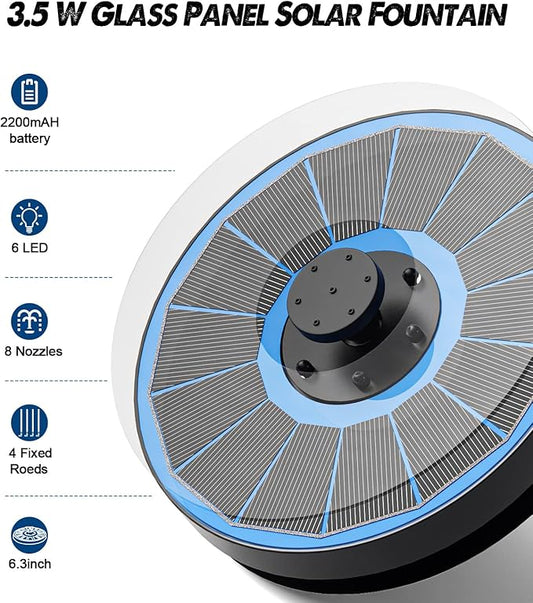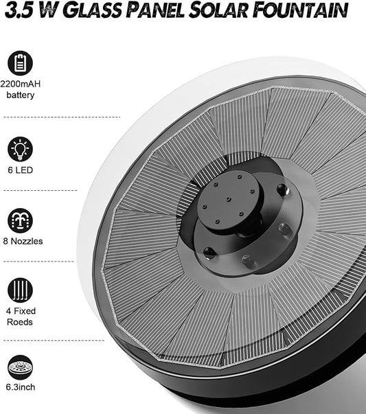 Solar Fountain Glass Panel with 2200 mah Battery, 3.5W Floating Solar Water Fountain with 4 Fixed Rods, Solar Fountain Pump for Bird Bath, Garden, Pond, Pool, Outdoor-White Lights