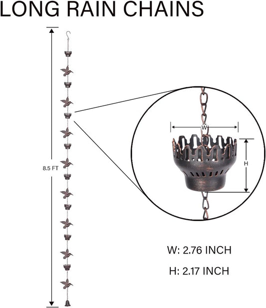 8.5Ft Hummingbird and Cup Rain Chain Outdoor Decorative Rain Gutter Drain Rain Catcher Gutter Chain with Bell
