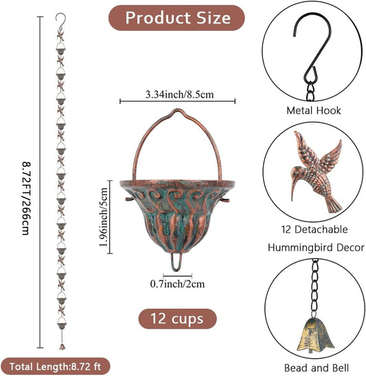 Rain Chain for Gutters, 8.7 Ft Rain Chains with 12 Cups & Detachable Hummingbird Decor, Adjustable Rain Catcher Chain with Bell for Eaves Drainage, Replacement for Downspout