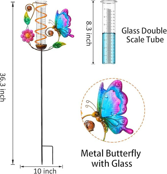 LEWIS&WAYNE 36.3” Butterfly Rain Gauge Outdoor, 7” Glass Tube Solar Powered 10 Warm White LEDs Garden Metal Stakes Decorative Waterproof for Yard Garden Patio Lawn