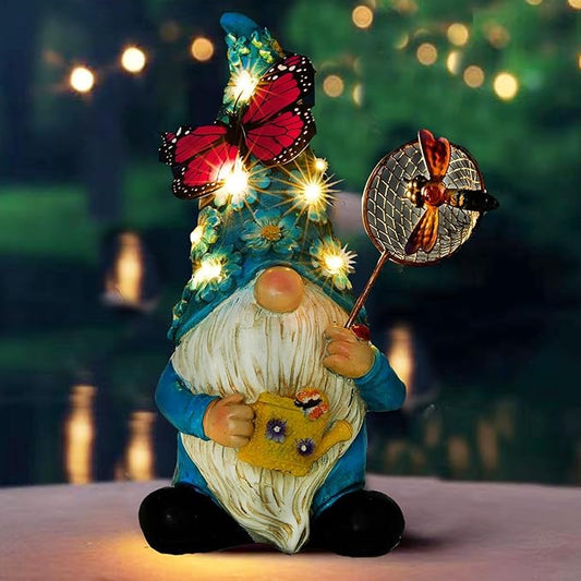 Garden Gnome Statues Outdoor Decor Solar Gnomes with Butterfly on LED Lighted Flowers, Resin Blue Gnomes Sculpture for Patio Yard Lawn Onament Decoration