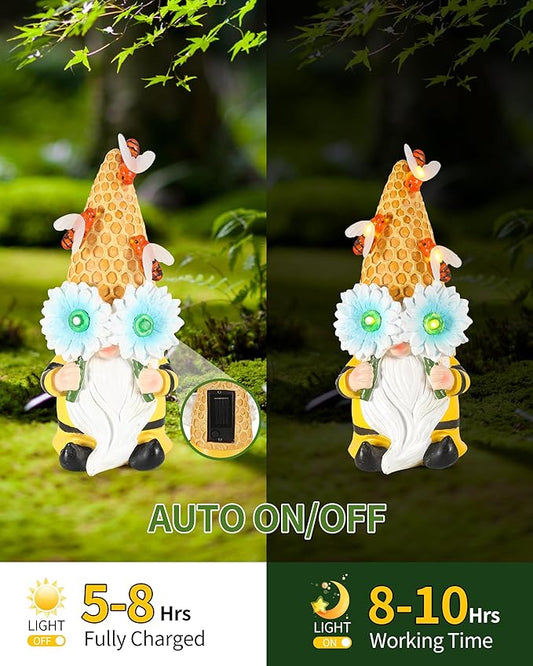 Garden Gnome Statue Solar Powered with Glowing Bees Sunflower Outdoor Funny Resin Figurine Decorations for Patio Yard Lawn Porch Housewarming Ornament Gift