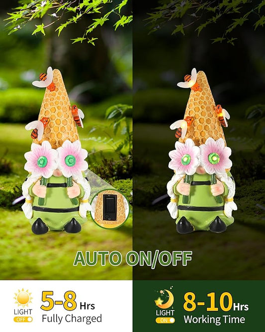 13" Garden Solar Spring Gnomes Statues Outdoor Spring Decor with LED Lighted Bee and Flowers Funny Garden Sculpture for Patio Yard Lawn Decorations Gifts