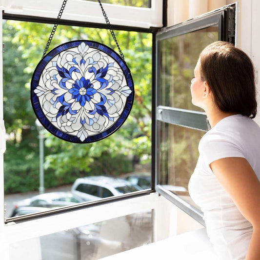 Stained Glass Window Hanging - Blue White Boho Flower Suncatcher for Door Garden Yard Sun Catchers Decor Christmas Mother's Day Birthday Gifts for Women Mom Nana Friend Teacher 11.8 in