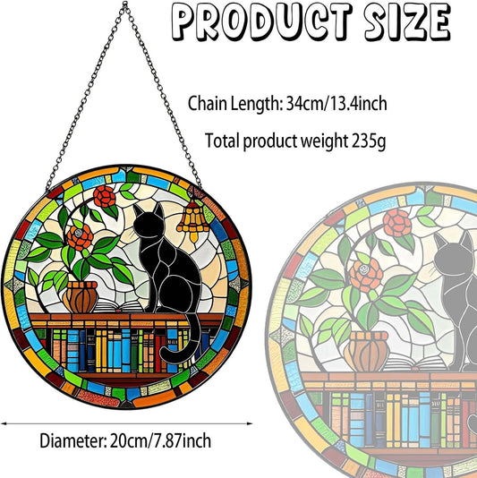 Cat Sun Catcher Stained Glass Window Hanging Book Lover Gifts for Women Book Wall Decor Handmade Sun Catcher Black Cat Sitting On Bookshelf Decoration for Home Room Housewarming Gifts