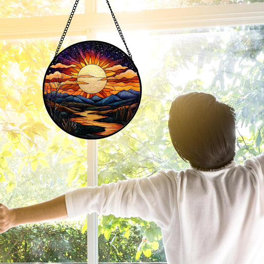 Stained Glass Window Hanging, Sunset Abstract Sun Catchers Colorful Glass Panel Landscape Suncatcher Decor for Birthday for Women, Men, Wife, Aunt, and Mom 14.9x14.9 in