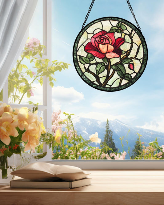 Stained Glass Window Hanging, Red Rose Flowers Sun Catcher for Door Garden Home Decor Suncatcher Christmas Mother's Day Birthday Gifts for Women Lovers Men Wife Girlfriend Mom Nana 7.8 in