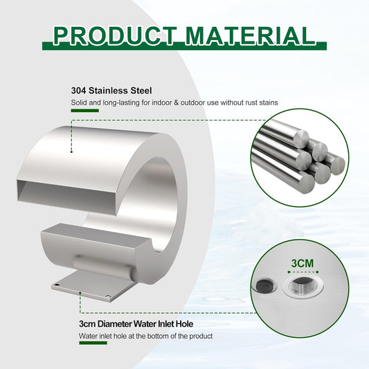 Pond Waterfall Spillway LONGRUNNEW 304 Stainless Steel 11.8" Rectangular Waterfall Spillway, Water Fall Fountain with Pipe Connector for Garden Outdoor, Swimming Pools, Fountains, Pond and Spa