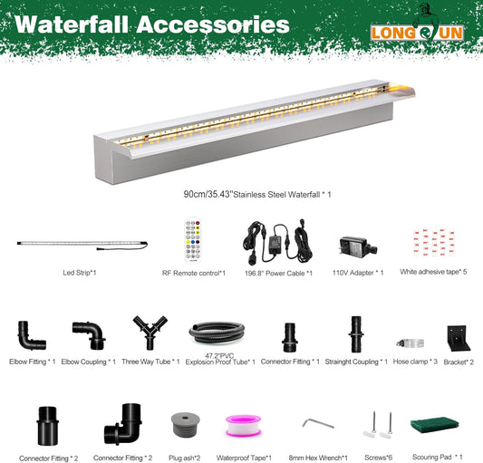 LONGRUN Waterfall Pool Fountain, Updated 5.9'' Wider Open Lip Stainless Steel Waterfall Spillway, Decorative Water Feature for Swimming Pools, Koi Ponds, Spa & Garden - 35.4''