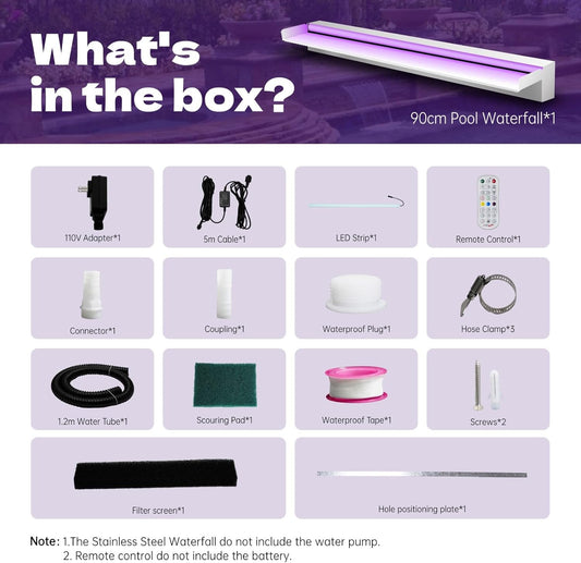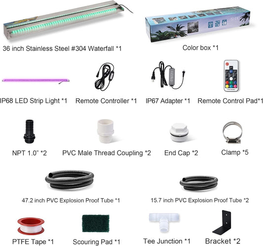 YUDA 36" Stainless Steel Waterfall Pool Fountain with SMD LED 7 Color Changing and Remote, Lighted Waterfall Spillway for Sheer Descent Garden Outdoor