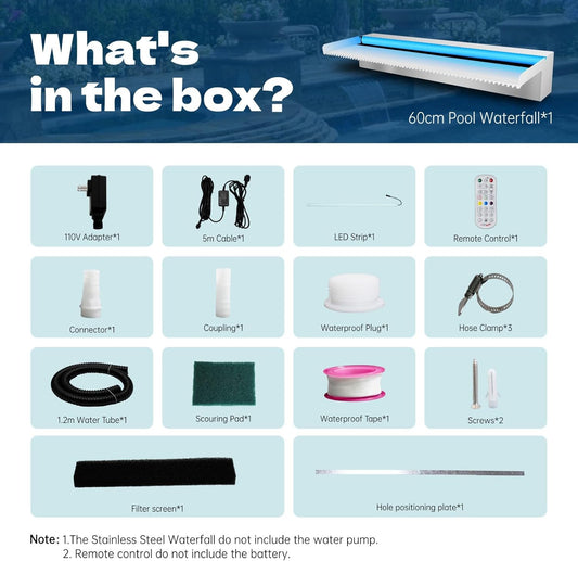 Pool Fountain, LONGRUN Waterfall Spillway for Koi Ponds - 23.6" Transparent Acrylic Waterfall Multi-Color LED Lights for Swimming Pool, Garden Pond, Patios, Spa Decoration