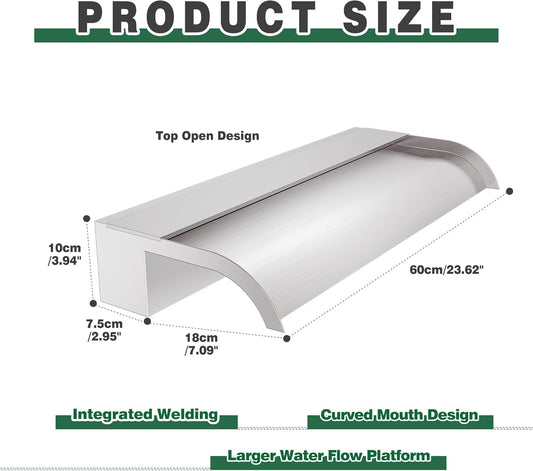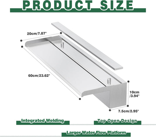Waterfall Spillway, Stainless Steel Pool Fountain w/Top Open Lip & Pipe Connector Kits for Outdoor/Indoor Decorative, 23.6'' Pool Water Feature for Garden Patio, Backyard Koi Pond Decor