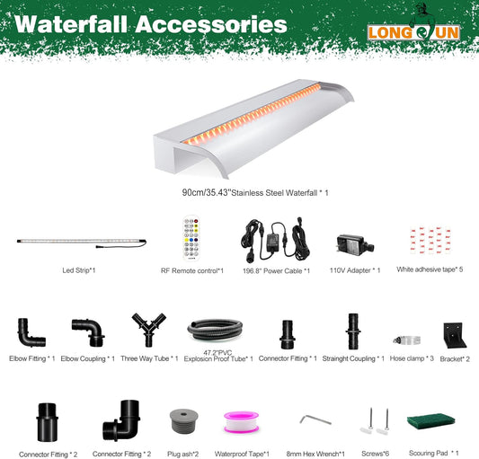Waterfall Pool Fountain, LONGRUN Stainless Steel Waterfall Spillway for Pools and Ponds - 35.4" Wide Decorative Water Feature for Swimming Pools, Koi Ponds, and Garden