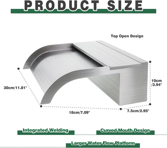 Waterfall Spillway, Stainless Steel Pool Fountain w/Top Open Lip & Pipe Connector Kits for Outdoor/Indoor Decorative, 11.8'' Pool Water Feature for Garden Patio, Backyard Koi Pond Decor