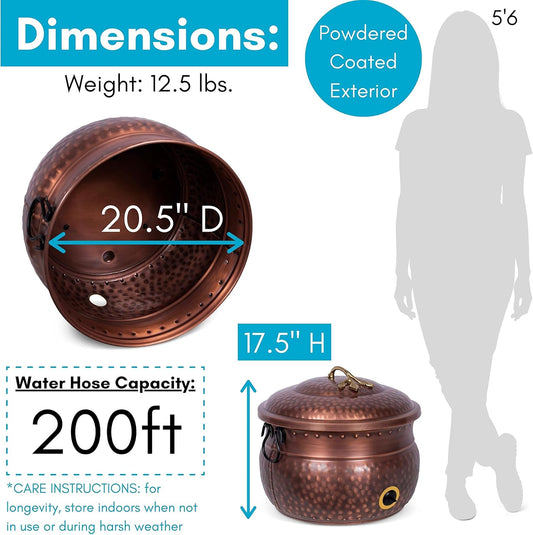 BirdRock Home Water Hose Holder with Lid | Ground Garden Hose Pot | Decorative | Handle | Embossed | Steel Metal with Copper Accents | Outdoor or Indoor Use