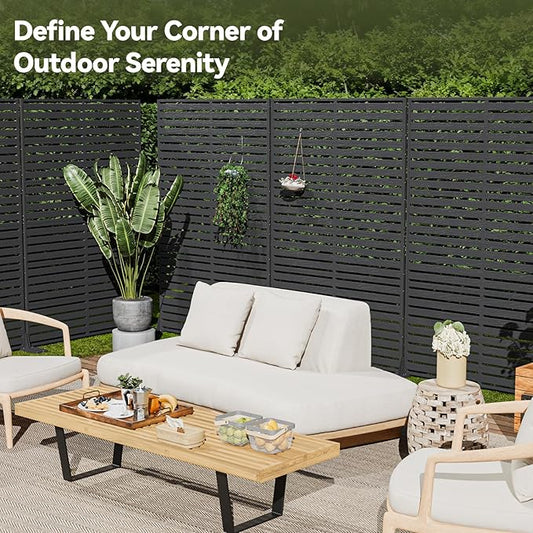 Kozyard Metal Privacy Screen 74" H x 47.2" W Decorative Outdoor Divider with Stand Panels Freestanding Screen Set for Deck Patio Balcony Garden Outdoor&Indoor(Black/Horizontal Slat)