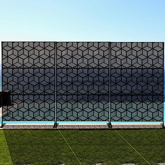 Kozyard Metal Privacy Screen 74" H x 47.2" W Decorative Outdoor Divider with Stand Panels Freestanding Screen Set for Deck Patio Balcony Garden Outdoor&Indoor(Black/Cube)