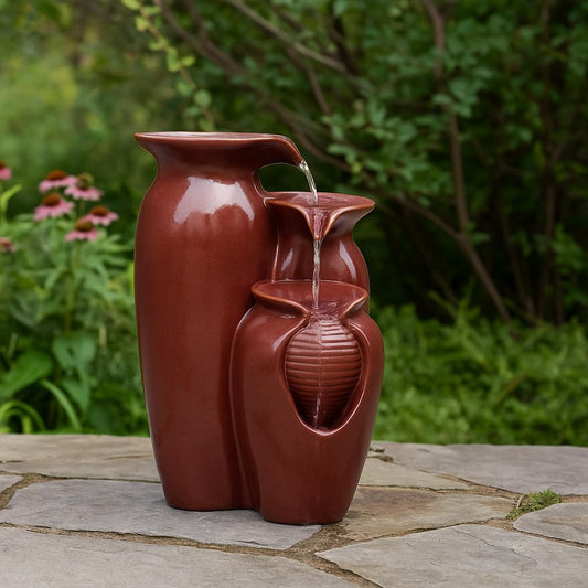 Teamson Home Jar 3 Tiered Floor Waterfall Fountain with Pump for Outdoor Patio Garden Backyard Decking, 20 Inch Height, Brown