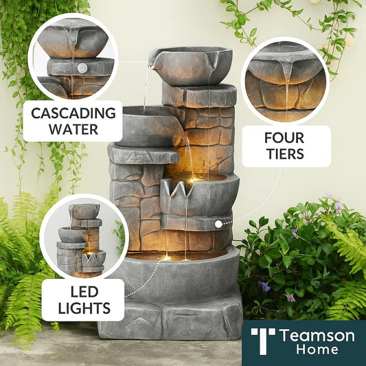 Teamson Home 28.5" Outdoor 4-Tier Stacked Stone Cascading Water Fountain with LED Lights, Gray
