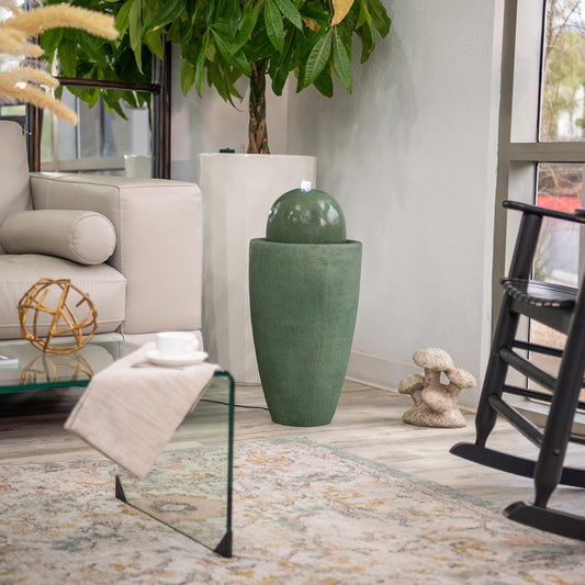 XBrand 25.98" H Round Stone Indoor/Outdoor Modern Stone Textured Sphere Water Fountain w/LED Lights, Green