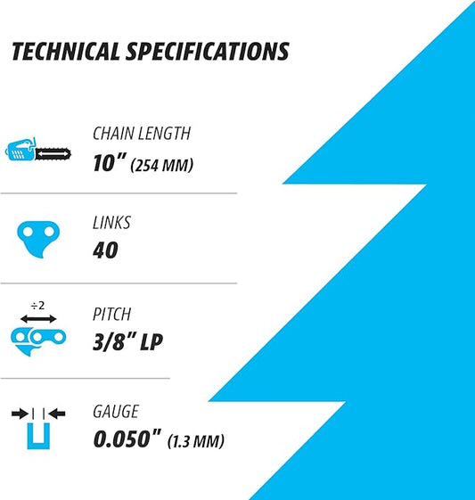 10 Inch Chainsaw Chain 3/8" LP Pitch, 050" Gauge, 40 Drive Links, German Steel, fits MAKITA, ECHO, Remington RM1035P, Worx WG309, Sun Joe SWJ803E, Craftsman - and more