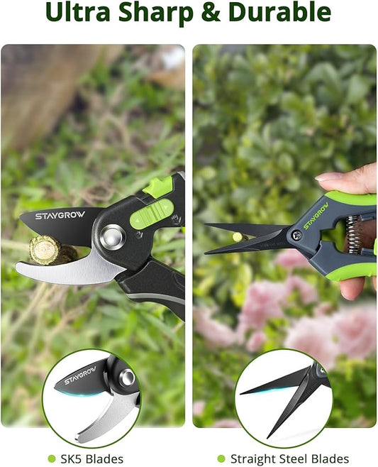Garden Shears Set: 8.5" Bypass Pruning Shears & 6.5" Straight Trimming Scissors, Ultra-Sharp Garden Scissors with Stainless Steel Blades, Safety Lock, Gardening Gifts for Women Men, 2 Pack