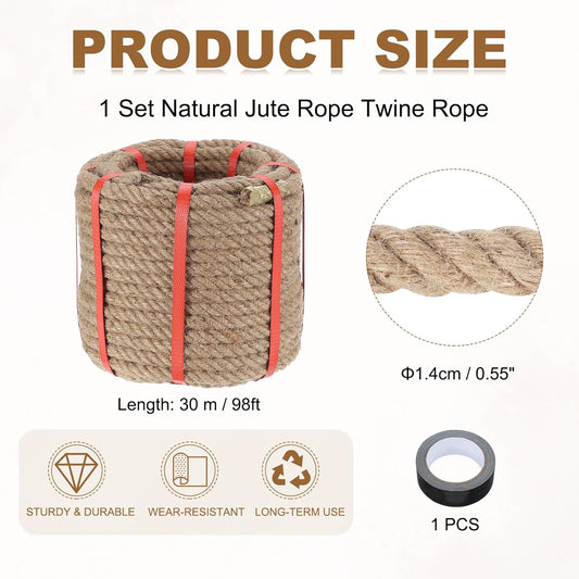 MECCANIXITY Jute Rope 0.55 Inch x 98ft, Thick Twine Rope Ropes Braided Jute Twine Natural Brown Burlap Cord String Heavy Twisted with Tape for Decorative Crafts Railing Swing Tug of War
