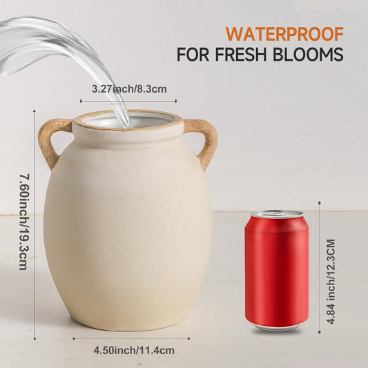Mitt&Ditt Ceramic Flower Vase with Handles, 8 inch Tall Off-White Vase, Decorative Terracotta Vases, Farmhouse Rustic Pottery Vases for Home Decor, Living Room, Table
