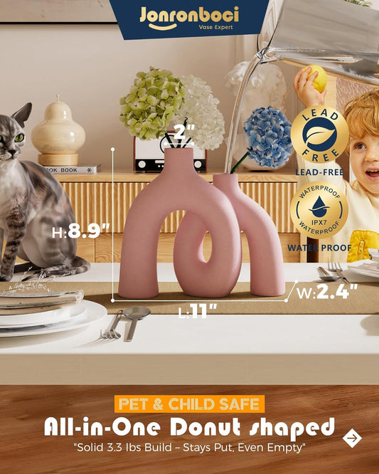 Hug Donut Decorative Vase Set - Light Pink Modern Glam Eclectic Style Vases Home Decor, Matte Ceramic Decorations for Living Room Shelf, Bookshelf Mantle Entryway Table or Console DΓ©cor(Pink)