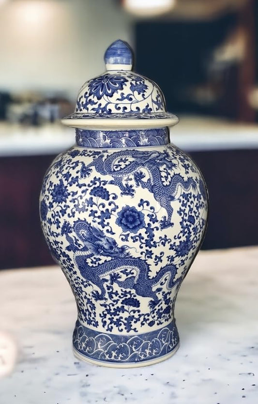 20" Classic Blue and White Floral Porcelain Ceramic Temple Ginger Jar Vase, Large China Qing Style (Dragon1)