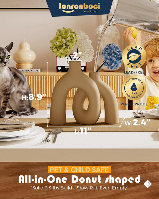 Hug Donut Decorative Vase Set - Tan Modern Rustic Farmhouse Style Vases Home Decor,Matte Ceramic Decorations for Living Room Shelf, Bookshelf Mantle Entryway Table Centerpiece or Console DΓ©cor(Brown)