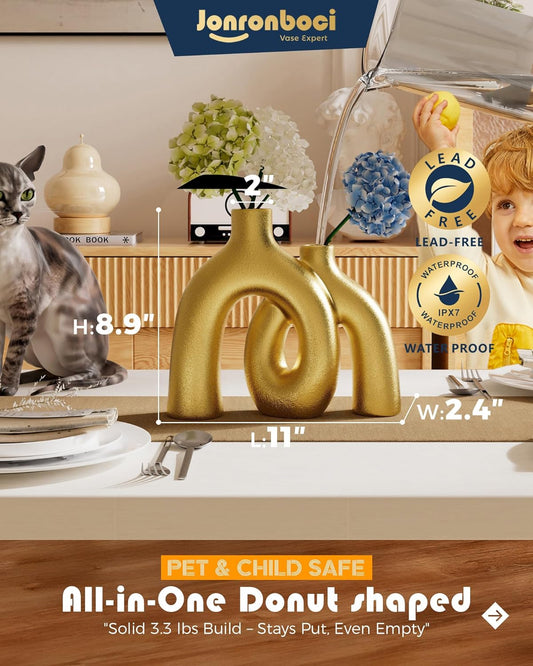 Hug Donut Decorative Vase Set - Golden Modern Classic Transitional Style Vases Home Decor, Matte Ceramic Decorations for Living Room Shelf, Bookshelf Mantle Entryway Table or Console DΓ©cor (Gold)