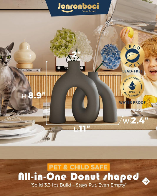 Hug Donut Decorative Vase Set - Dark Gray Modern Minimalism Industrial Style Vases Home Decor, Matte Ceramic Decorations for Living Room Shelf, Bookshelf Mantle Entryway Table or Console DΓ©cor(Gray)